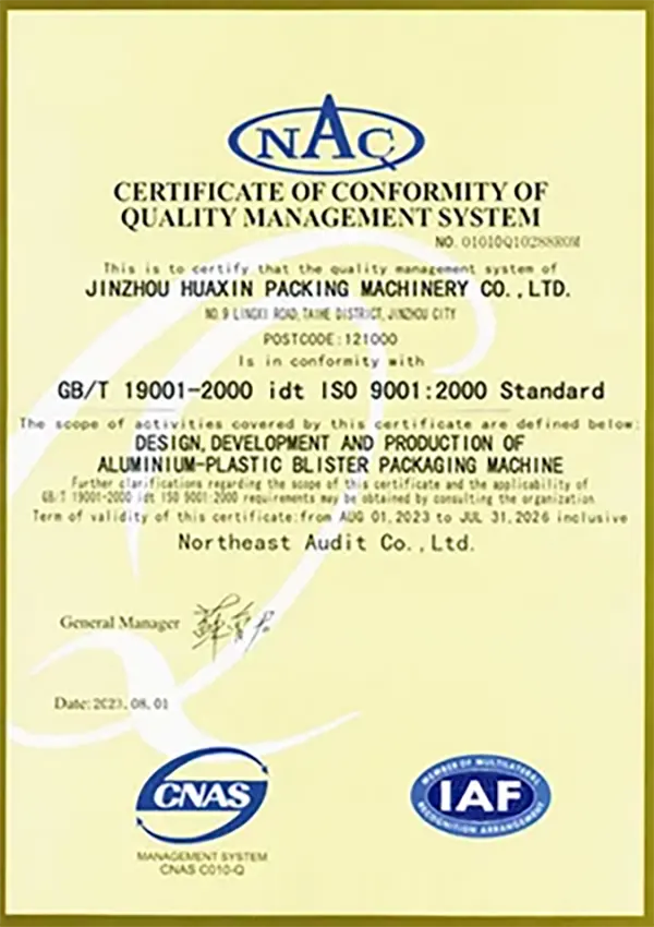 The company founder graduated from Shanghai Jiao Tong University and is among the first senior technical engineers in New China. In 1981, he designed and developed China’s first aluminum-plastic blister packaging machine and launched the nation’s first high-speed blister packaging machine in 1997. Huaxin Package has long been a member of the China Pharmaceutical Equipment Association, the first to achieve ISO9001 international quality certification, and has obtained multiple national patents. Subsequently, the company introduced 4-side sealing sachet packaging machines, high-speed cartoners, and independently developed high-speed Alu-PVC and Alu-Alu blister cartoning machines.