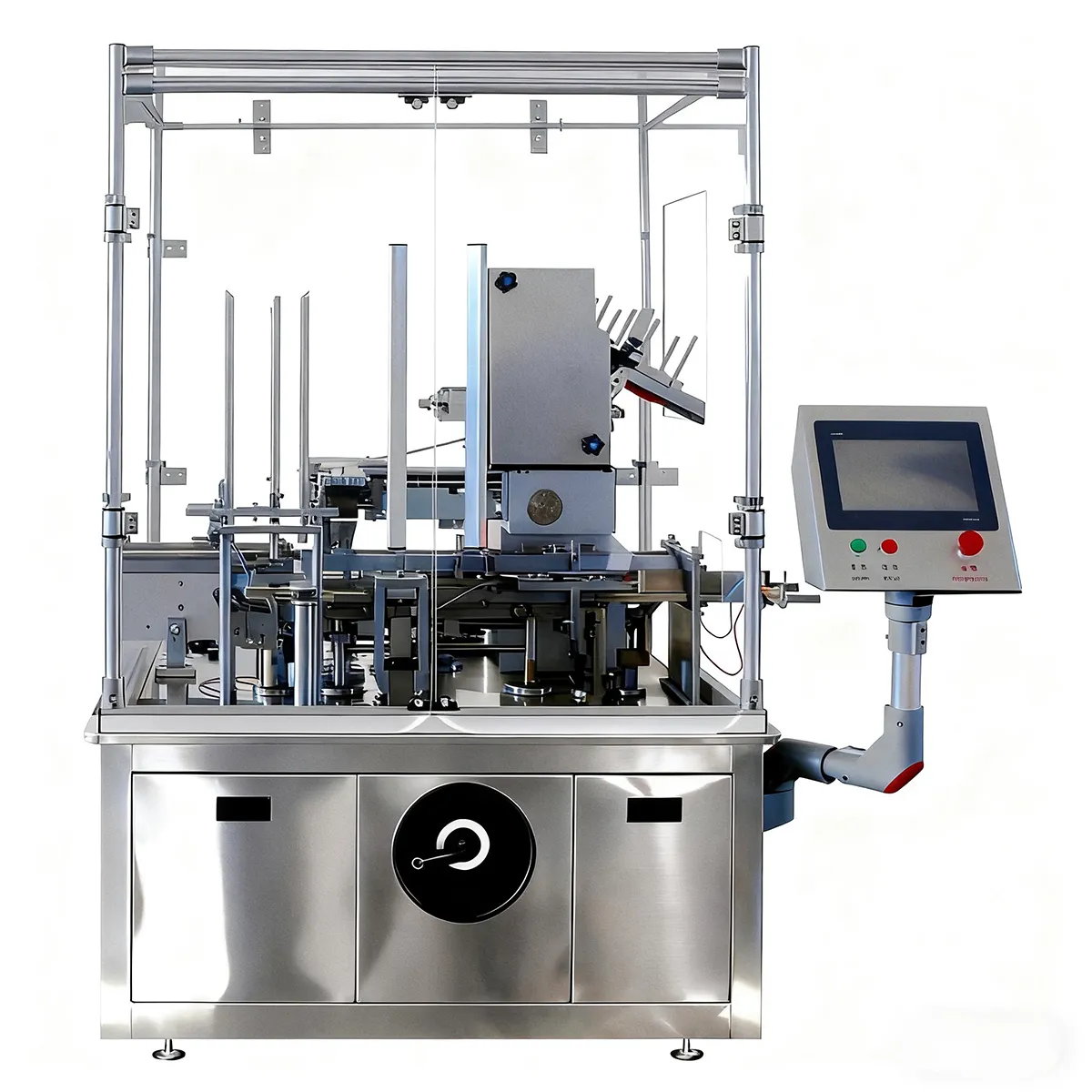 The equipment is a vertical intermittent motion cartoner. It can sequentially complete processes such as product feeding, material transfer, leaflet folding, leaflet insertion, carton erection, product insertion, and carton sealing. The entire cartoning process is fully enclosed.
